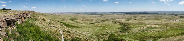 The second UNESCO World Heritage site we visited was on the way from Waterton Lakes back to Lethbridge -- Head-Smashed-In Buffalo Jump. (ヘッド-スマッシュト-イン・バッファロー・ジャンプ). It's a beautiful site, with an extraordinary expansive view across the plains from up on the cliff. The landscape becomes especially poignant with the knowledge of its cultural and historic significance as one of many places in the region where the Blackfoot drove herds of bison down the cliff as a method of hunting-- a practice that continued for about 6000 years until the 19th century. The interpretive centre at the site, built in 1987, is nestled into the cliff and is almost invisible from the highway below. Its main entry hall showcases two bison lurking nervously (?) at the edge of a man-made precipice, perhaps about to plunge to their deaths...